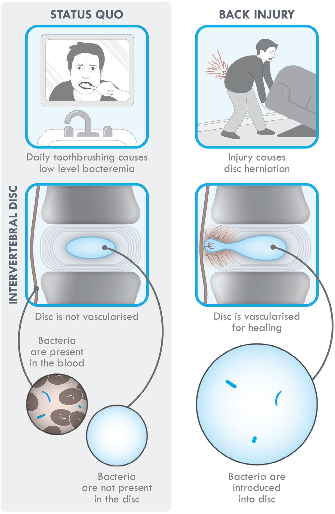 Microbiology studies suggest that approximately 50% of spinal discs with adjacent Modic changes are infected with bacteria, with Cutibacterium acnes (C. acnes) responsible for 80% of these infections. Infection can occur during the healing process after disc herniation or injury as the area becomes vascularized to support repair. During this phase, bacteria may infiltrate the disc, leading to a chronic low-grade infection that causes inflammation, bone degradation ultimately resulting in vertebral oedema observed as Modic changes (figure 1).